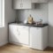 Büroküche bestehend aus Spanplattenunterbau mit Melaminbeschichtung in verschiedenen Farben und Edelstahlauflage. Die Singleküche kann wahlweise mit Massekochfeld, oder ohne Kochfeld, einer Armatur, einem Geruchsverschluss, und Warmwasserspeicher, und einem Kühlschrank mit oder ohne Gefrierfach ausgestattet werden. Weiterhin kann unter dem Spülbecken eine Schublade und ein zur Miniküche optisch passender Oberschrank sowie ein Einbauabfallsammler mit 2 x 15l Inhalt dazu mitbestellt werden. Für den Anschluss des Kochfeldes genügt eine Steckdose. Die Bedienknöpfe des Kochfeldes sind praktisch an der Oberen Seite der Edelstahlauflage angebracht.