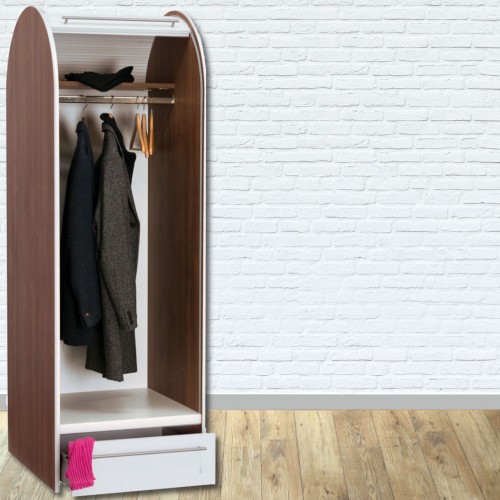 Die Grundausstattung ist mit einem durchgehenden Fallrollo im oberen Bereich und einer Schublade im unteren Bereich der Front ausgestattet. Die Schublade ist mit einer Schließung und Dämpfung versehen. Beide Stangengriffe mit 485 mm in Edelstahloptik runden das Bild des Garderobenschrankes ab. Der Korpus ist aus einer beidseitig beschichteten Dekorspanplatte 8/19 mm gefertigt. Alles Sichtkannten sind mit einer 2 mm ABS-Kante gerundet versehen. Am Boden befinden sich vier Stellfüße um den Schrank vor Ort den Bodenverhältnissen anpassen zu Können.