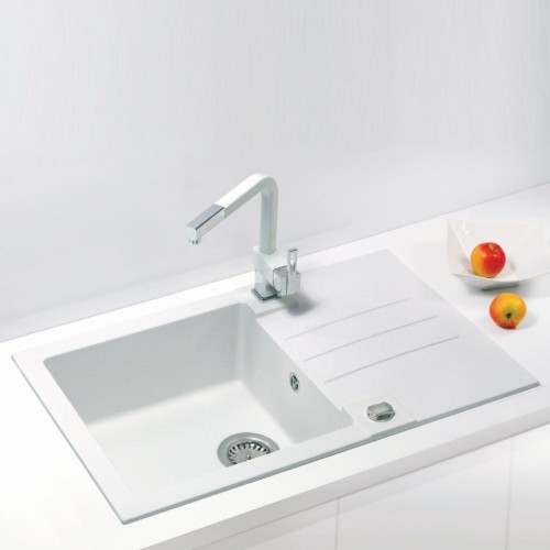 Die Rock 130 ist eine hochwertige Einbauspüle aus robustem Kunstgranit (Algranit), die durch ihre klare Formgebung und praktische Ausstattung überzeugt. Dank der reversiblen Bauweise lässt sich die Spüle flexibel mit der Abtropffläche links oder rechts montieren – ideal für unterschiedliche Küchenlayouts. Die glatte Oberfläche sorgt für eine einfache Reinigung und ein hohes Maß an Hygiene.
